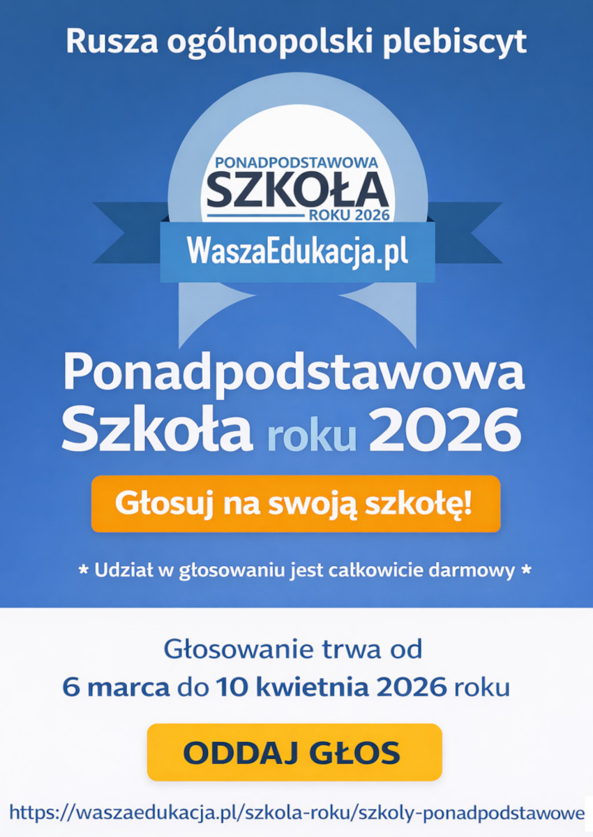 Nasza szkoła została zakwalifikowana do ogólnopolskiego plebiscytu „Ponadpodstawowa Szkoła Roku 2026”, organizowanego przez portal edukacyjny WaszaEdukacja.pl. Plebiscyt ma charakter społecznościowy, a o wynikach decydują głosy uczniów, rodziców, absolwentów oraz sympatyków[…]