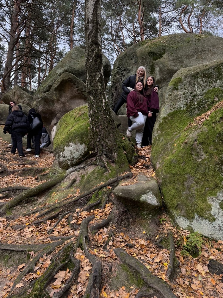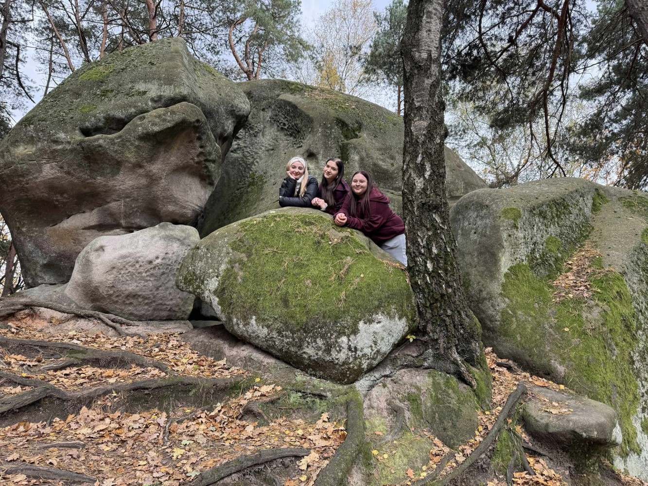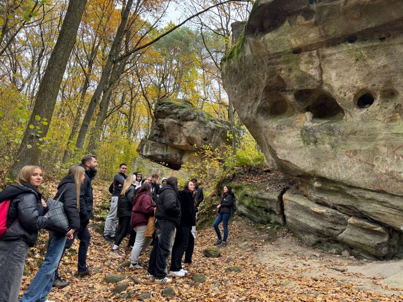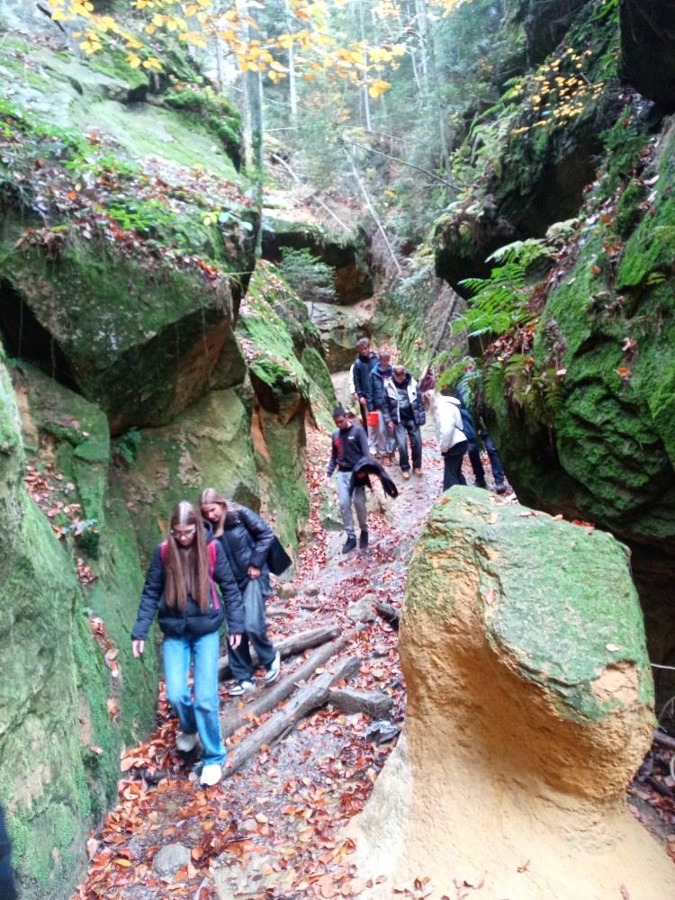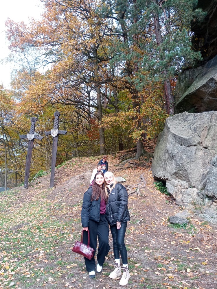 Pierwszy dzień w Ciężkowicach rozpoczęliśmy zwiedzaniem z przewodnikiem rezerwatu przyrodniczego „Skamieniałe Miasto”. Usłyszeliśmy historie związane z poszczególnymi skałkami i okolicą. Według dawnych legend, to nie siły przyrody spowodowały powstanie Skamieniałego Miasta, lecz klątwa rzucona na dawnych mieszkańców jako kara za występne życie. Urzekły nas piękne widoki okolicy. Skały przybierają tu fantastyczne formy Czarownicy, Orła, Borsuka, a wąwóz z wodospadem naprawdę warto zobaczyć.