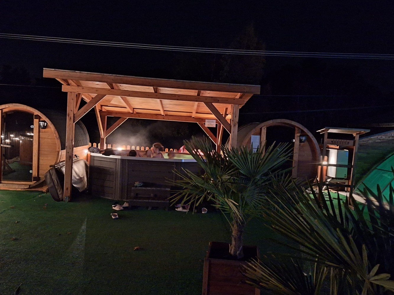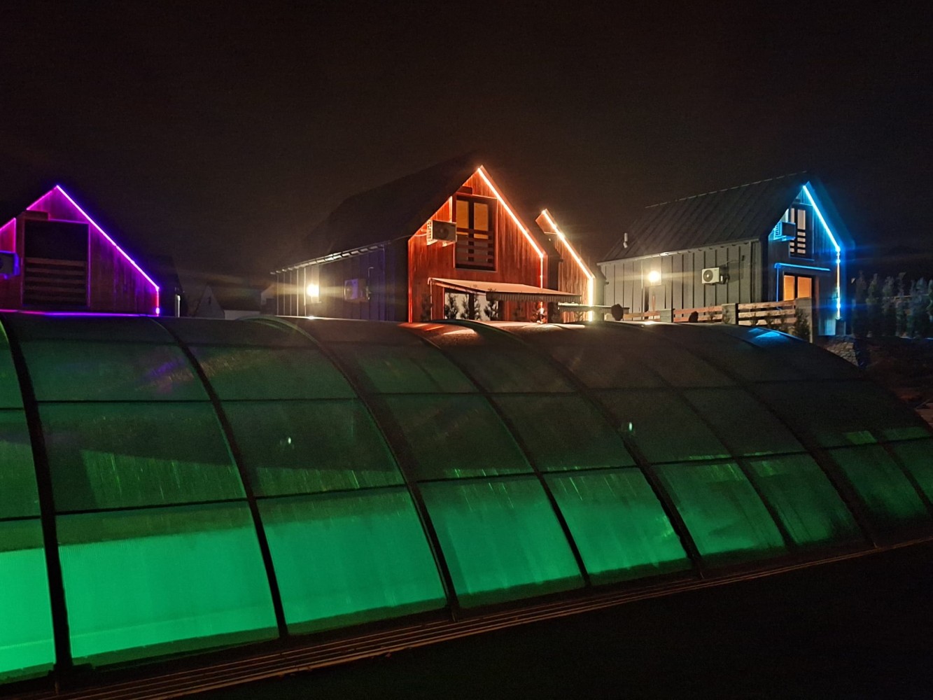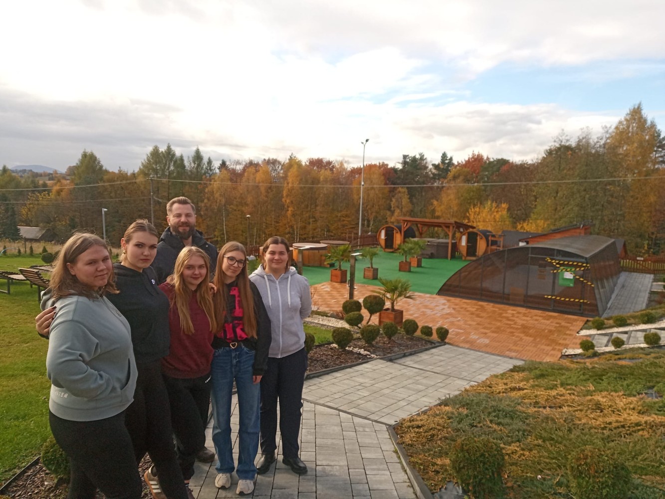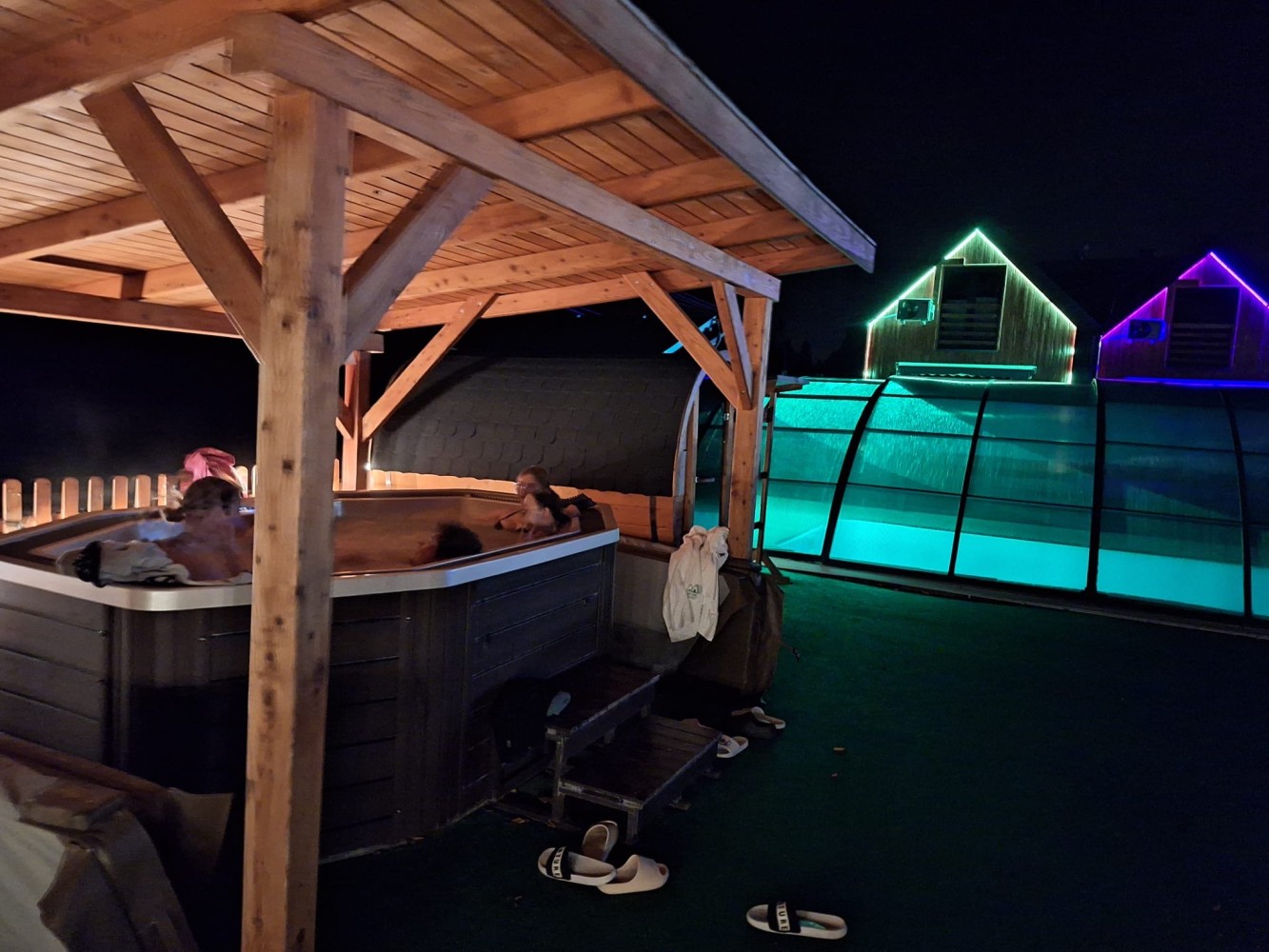 Dzień zakończyliśmy w „Zielonej osadzie” gdzie nowe domki w stylu skandynawskim ukazały się wieczorem w bajkowej scenerii. Młodzież zanurzyła się w jacuzzi i relaksowała , ciesząc się ciszą i spokojem . Basen sauna i balia ruska to dodatkowe atrakcje „Zielonej osady”